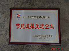 2012年2月8日,在山西省道路運(yùn)輸工作會(huì)議上,我公司獲得由山西省交通運(yùn)輸管理局頒發(fā)的2011年度全省道路運(yùn)輸行業(yè)《節(jié)能減排先進(jìn)企業(yè)》榮譽(yù)稱(chēng)號(hào)。