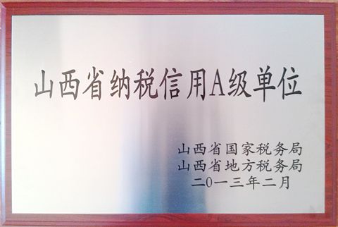 2014年元月15日,我公司榮獲省國(guó)稅、省地稅聯(lián)合頒發(fā)的“山西省納稅信用A級(jí)單位”榮譽(yù)稱號(hào)。