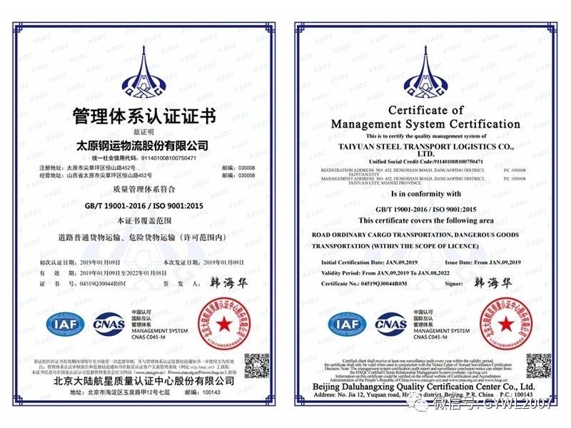 2019年1月,公司通過ISO9001質(zhì)量管理體系、ISO14001環(huán)境管理體系、ISO18001職業(yè)健康安全管理體系認證。ISO三標一體認證的通過,標志著公司始終踐行推進冶金物流服務(wù)本質(zhì),持續(xù)強化以用戶為中心的服務(wù)理念;充分反映公司全力打造綠色****物流企業(yè)發(fā)展規(guī)劃的堅定決心,同時通過提高職業(yè)健康安全管理水平、優(yōu)化管理流程、完善管理體系、規(guī)范作業(yè)標準等手段提升公司競爭力,為公司開拓市場、永續(xù)發(fā)展提供了有力保障。